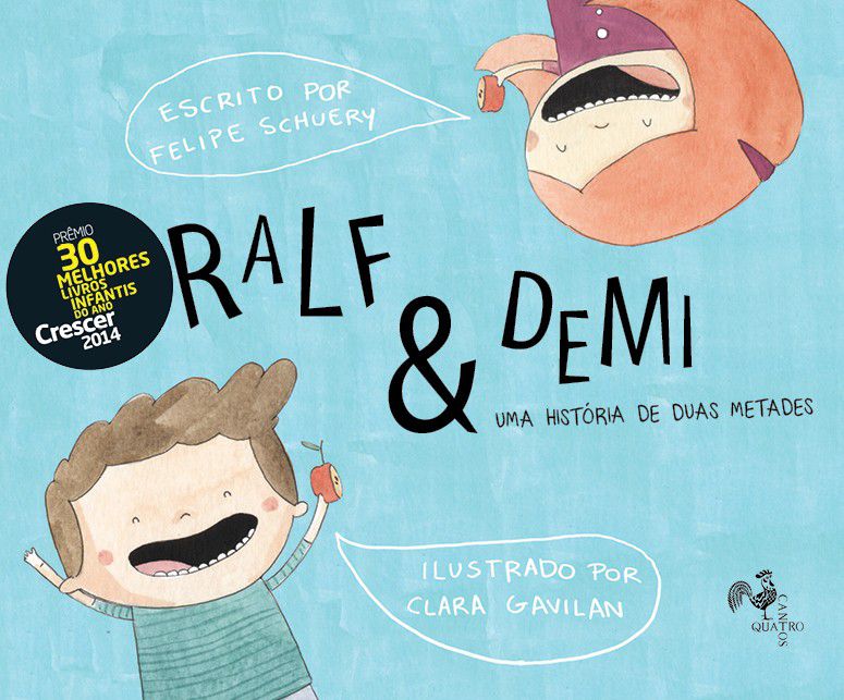 Em Ralf & Demi: uma história de duas metades, Felipe Schuery constrói uma deliciosa interação entre o menino Ralf, que só é capaz de fazer metade das coisas, e Demi, uma garota que só consegue fazer a outra metade. O que pode acontecer se essas duas “caras-metades” se encontrarem? Será que juntos poderiam ficar completos? Afinal, somos mesmo todos assim, ninguém é bom em tudo. E será que se fôssemos, a vida seria assim tão interessante? É isso que os pequenos leitores poderão descobrir nessa deliciosa e bem-humorada obra, delicadamente ilustrada com as lindas aquarelas de Clara Gavilan. Ótima leitura para crianças em início de alfabetização e pré-escolares, em leitura compartilhada com os adultos, que certamente também vão se identificar e se apaixonar por essa simpática duplinha de almas gêmeas. Prêmio 30 Melhores da Crescer 2014.